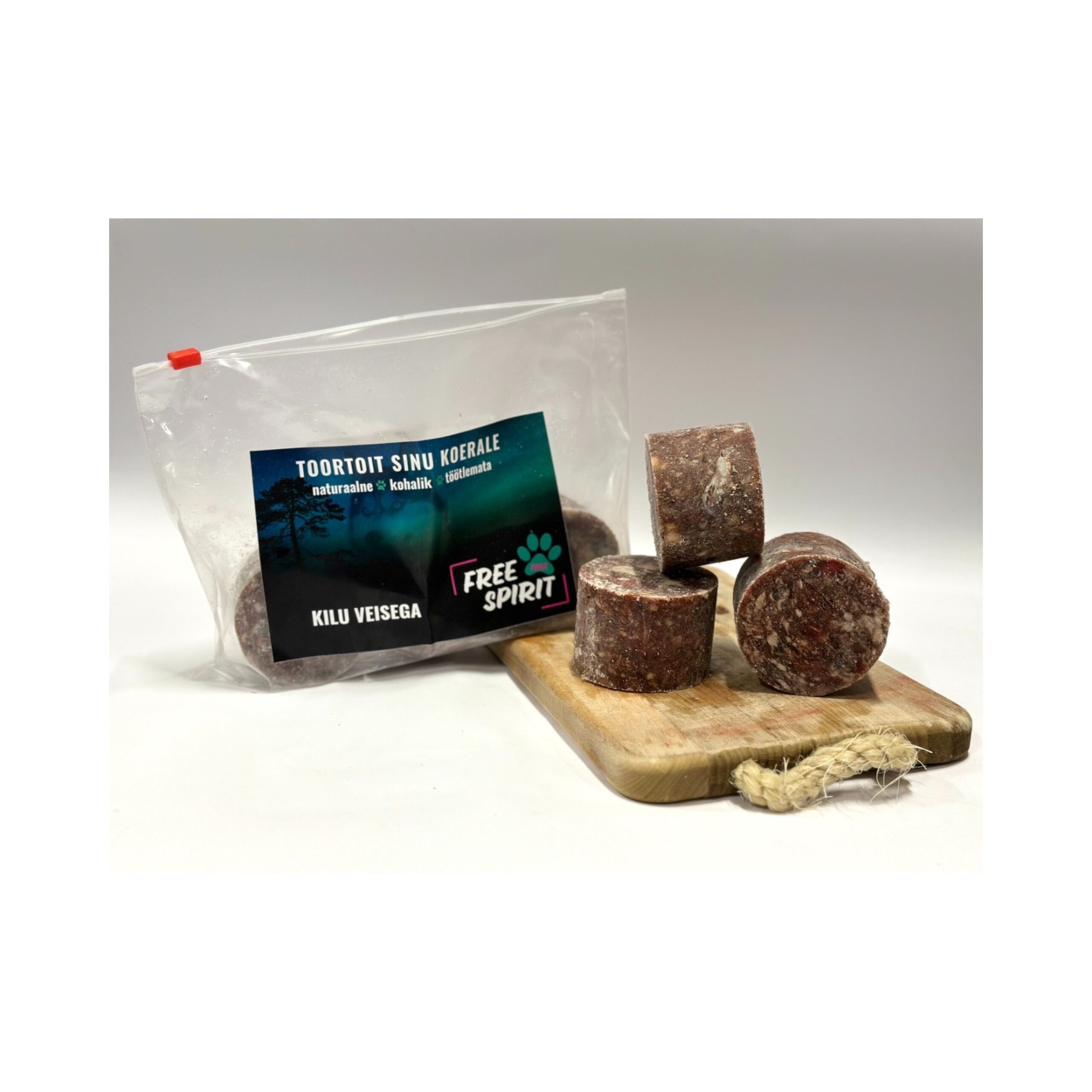 Koostis: Kilu 35%, veis (liha 35%, neer 8%, kops 8%, maks 6%, kõrv ja hingetoru 8%). Luu osakaal 5%, kõhr 8%.